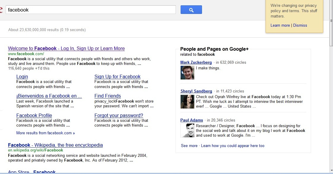 Sure, Facebook creator Mark Zuckerberg makes it first on the list, but every single result is from Google+. I understand that Google+ is part of Google, but given that Google is the largest search engine in the world, you would expect them to be a little less obvious about their heavy emphasis on Google+ social search results.