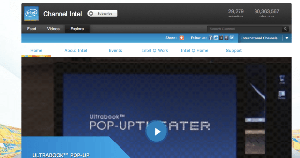 Lets take a look at how one major brand is using YouTube- and using it well. Intel has created their main consumer YouTube channel as “ChannelIntel”. When users arrive at Intel’s page, they are met with a custom, clean design that speak’s wonders of YouTube’s capabilities for brands. The use of this design helps separate it from user profiles.