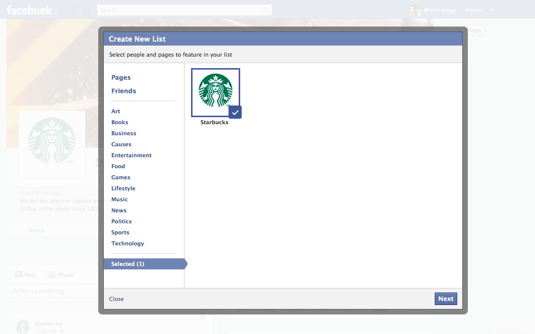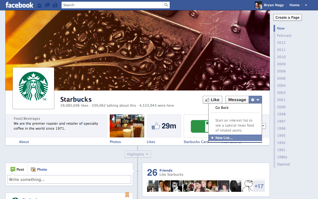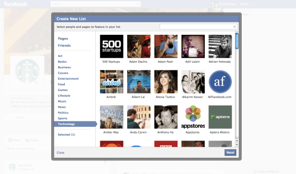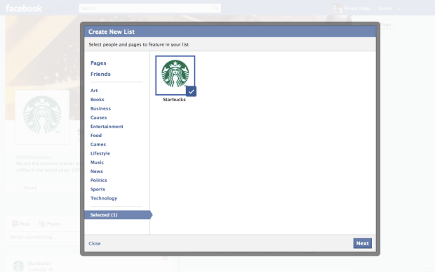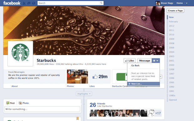 Users can also add a page to an interest list by clicking on the * after message on the new Timeline page profiles. This drops down to a “Add to interests” selection, where users are then prompted to add it to a list.