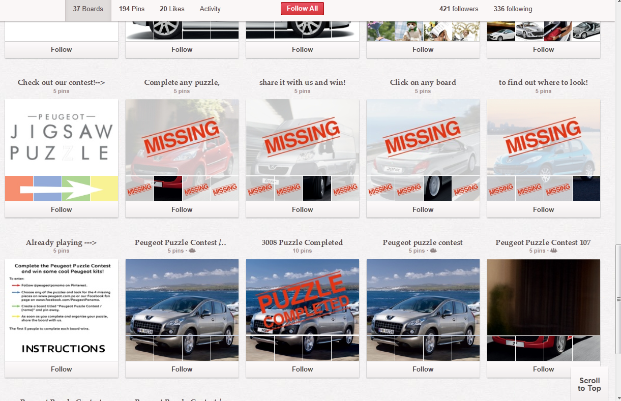 Users were asked to find the images that would fill in these puzzles. These images were scattered across the Peugeot Panama Facebook page and website. The first five users to find all of the puzzle pieces of a board, pin the missing images to their Pinterest profile, and send Peugeot a link won a prize.