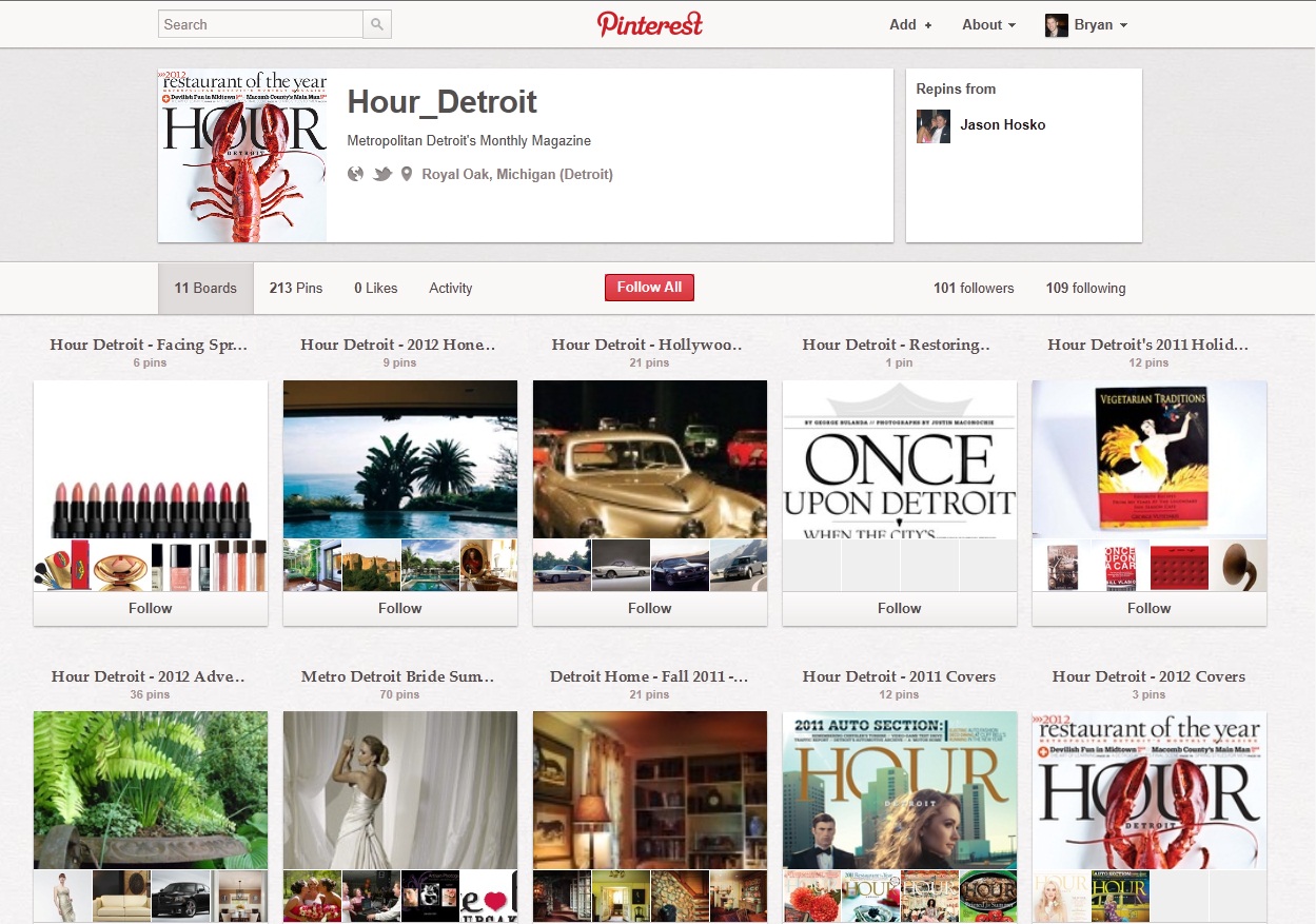 Hour Detroit is a popular monthly Detroit lifestyle magazine. They target younger professionals, but are popular for reviews, and many look to them when they release their top picks for different business categories for each year (like top restaurants, top salons, etc.). Hour Detroit’s Pinterest page has 101 followers. Hour Detroit got an early start on Pinterest, some of their pins dating back over 16 weeks ago. They tie in links to their website and Twitter page.