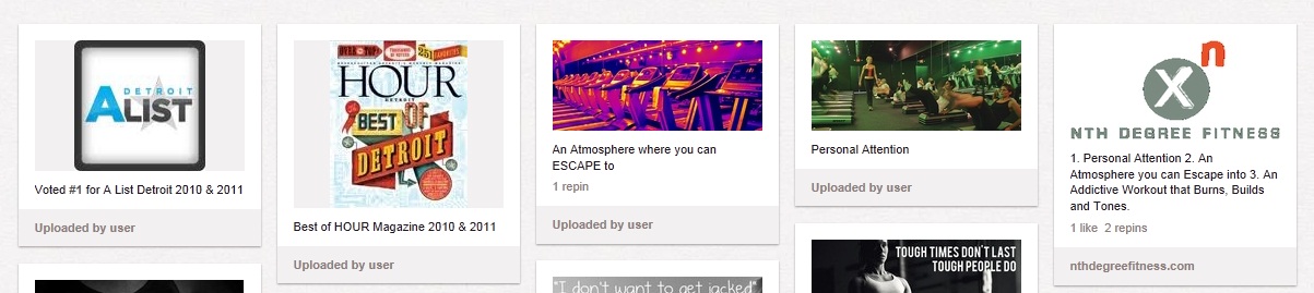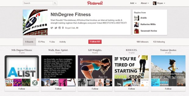 Nth Degree Fitness is a local small business gym in Royal Oak, MI, a trendy, up-and-coming suburb of Detroit. Nth Degree Fitness jumped on the Pinterest bandwagon early on. The business has 185 followers and has pinned over 70 photos to their boards. Their profile features linsk to their website and Facebook and Twitter pages. Unfortunately, it appears the Facebook link heads to the marketing leader’s profile, and their Twitter page doesn’t exist. Oops!