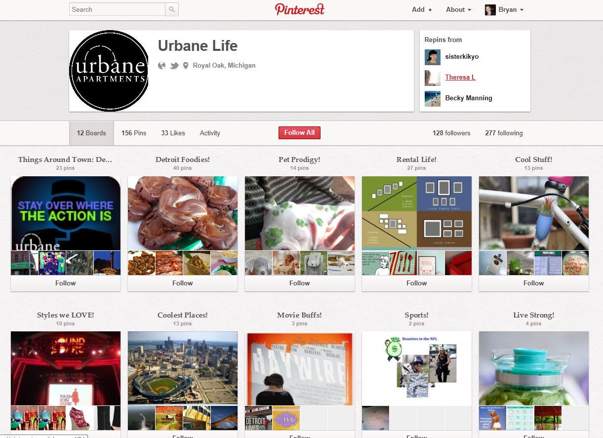 Urbane Life’s profile on Pinterest includes links to their website and Twitter page (their Twitter page is heavily followed). They post heavily, already at 156 pins after only being on Pinterest for what looks like 3 weeks. Urbane Life has 128 followers and 12 boards, covering topics like things to do around Detroit, Detroit food, rental life tips (such as how to hang photos), and styles they love. Many of the photos link to their website or relevant content.
