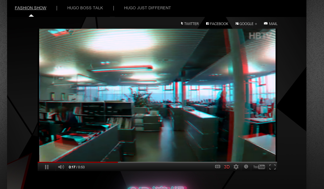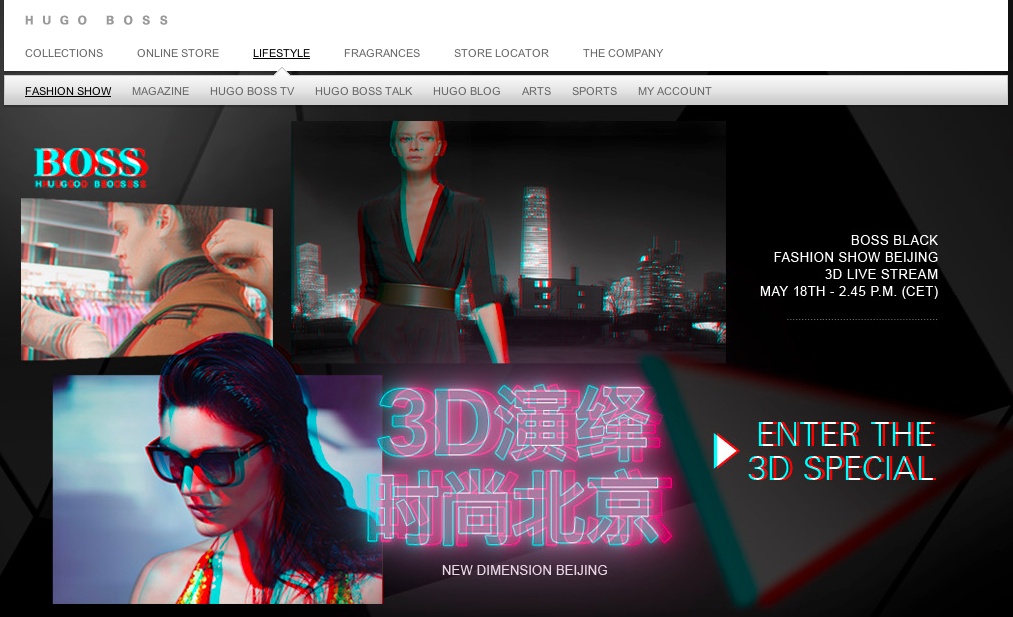 At the hub of the 3D campaign is Hugo Boss’ website. In their fashion show section dedicated solely to the promotion of the launch, all video, images, and text are in 3D. Visitors can explore additional content by clicking on different images, some of which lead to teasers from the Hugo Boss summer 2012 line and the ability to win a trip to the Fall/Winter line’s launch.