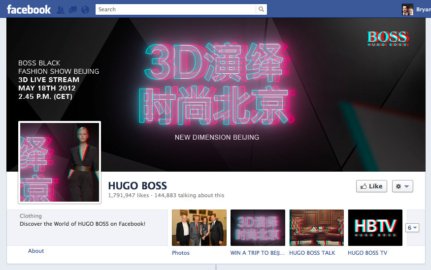 Hugo Boss has made the Boss Black 3D campaign social-oriented with tie-ins across multiple social media channels. On Facebook, Hugo Boss takes advantage of the new Facebook Timeline to inform visitors about the live stream fashion show. Images on the Hugo Boss Facebook page are in 3D, helping to add additional fun and excitement to the campaign.