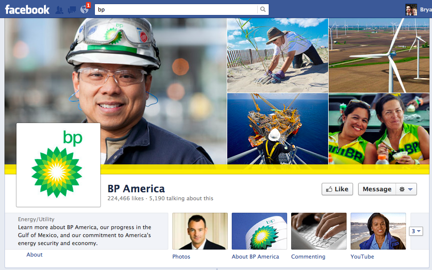 BP uses their Facebook Timeline as a PR outlet. After negative feelings towards the brand from their oil spill in the Gulf of Mexico, BP was on a spree to change their entire brand image to a company that supports the environment and new forms of energy. Naturally, BP does this on their Facebook Timeline, displaying images of nature, smiling people, and wind technology.