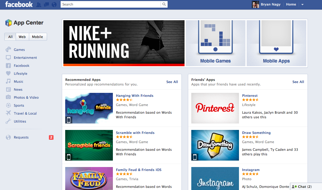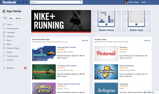 After weeks of rumors, Facebook has finally introduced its app center. Available on both the desktop and on mobile devices, the app center allows users to easily browse Facebook apps. The apps are organized into different categories, including by interest, top rated, trending, and top grossing. Facebook also recommends apps for a user to download based on apps they currently use. It also provides the user with a list of apps their friends are using.