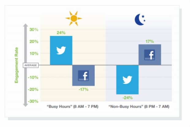 The study also found that engagement rates on Twitter were actually higher during the day than at night. This is a complete opposite of the engagement rates seen by Facebook. It’s possible that this is due to Twitter’s more “RSS-oriented” nature. It seems to me that people use Twitter more during the day (at work, at school), and then get home and check Facebook. Let’s face it- surfing Facebook is more involved than Twitter, so user’s probably aren’t engaging with posts too much while they are busy.