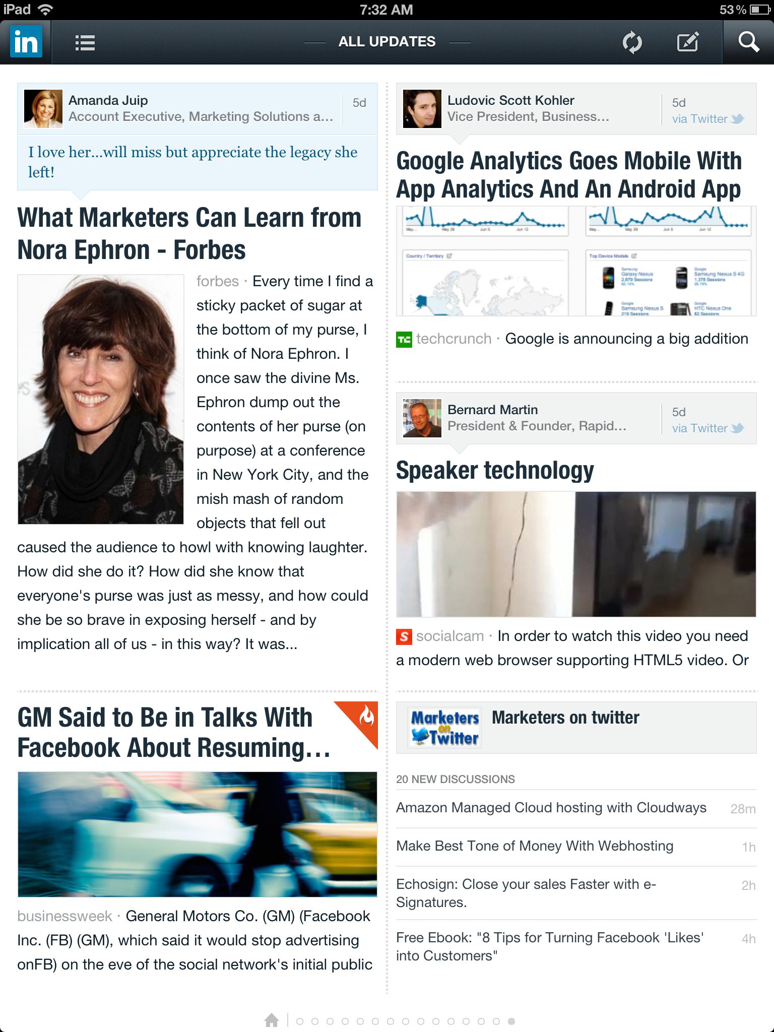 From what I’ve seen, the ads are unfortunately just simple standard display ads. Given the iPad’s unique user capabilities, such as swiping, tapping, turning, and pinching the screen, I’m a bit disappointed with what the brands are giving and what type of advertising LinkedIn is offering. To really be engaging users, I think LinkedIn, and all social networks looking to monetize their mobile presence, must come up with out-of-the-box ideas.