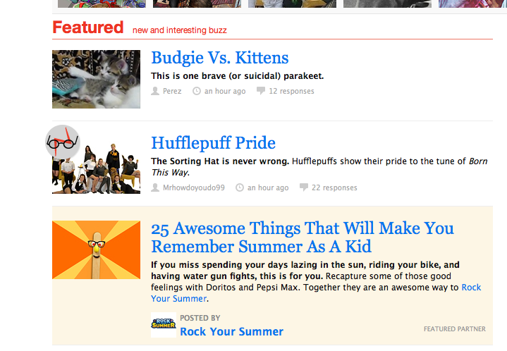 One social sharing site I think these companies really need to look at is BuzzFeed. Though not a full-blown social network, BuzzFeed ties-in brand advertising into the actual content of the page, and I think it’s a great way for brands to really begin the conversation with the social network users. After all, isn’t sharing and conversing what social networks are really all about?