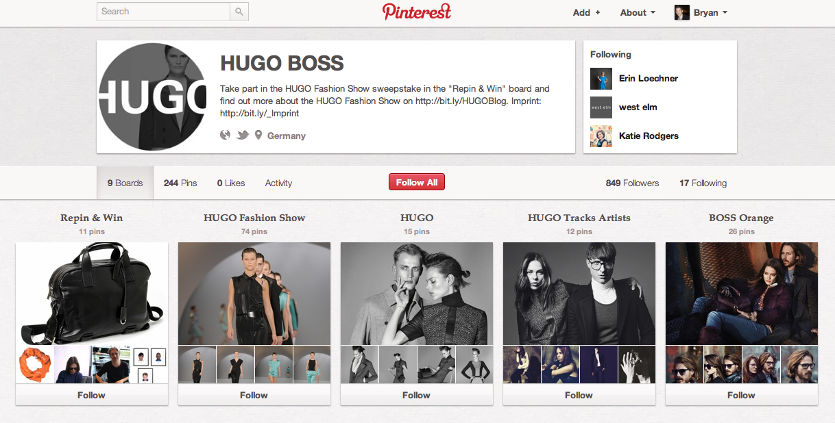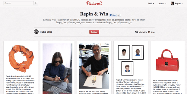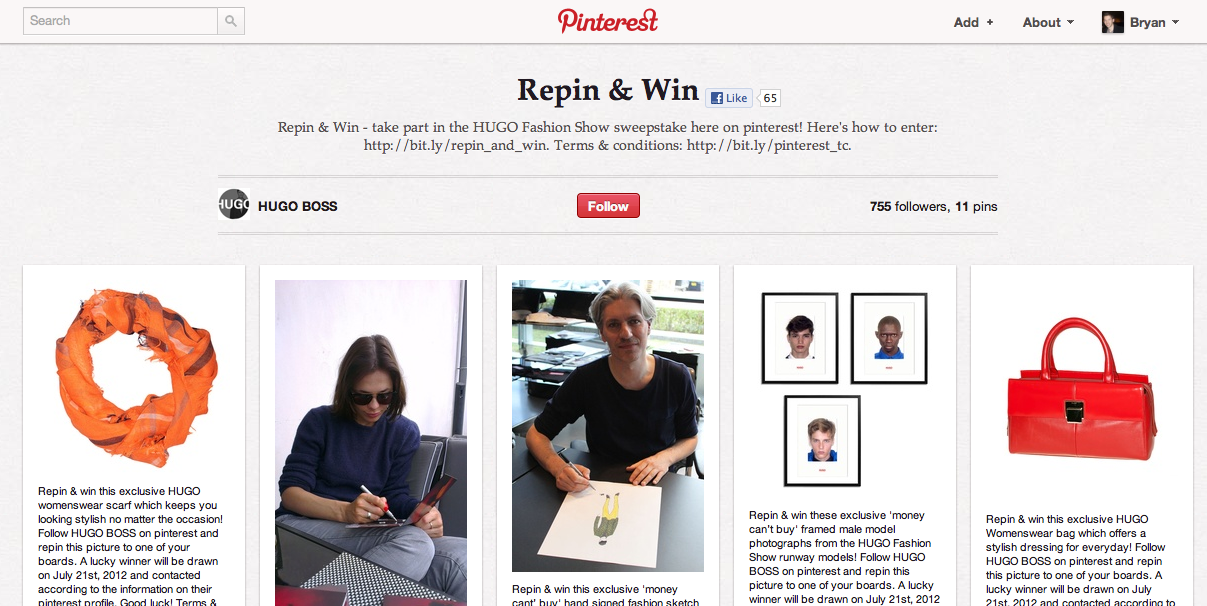 The “Repin & Win” campaign from Hugo Boss is a great example of how a brand is using Pinterest to market their products. For one, it requires users to follow Hugo Boss on Pinterest. Once a user follows Hugo Boss, all of the items Hugo Boss pins (including products linking directly to their e-commerce site) will be displayed in the user’s feed on Pinterest. This increases the exposure Hugo Boss has and therefore increases the chances for a sale. Secondly, since the contest requires users to repin the products they want to win, Hugo Boss gains additional exposure. Once a user repins a Hugo Boss pin, this pin is displayed to all of the users that follow this user on Pinterest. These users might see this pin and visit HugoBoss.com. They may even repin or like the product on Pinterest, meaning that their followers on Pinterest will see this Hugo Boss pin.