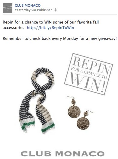 Ralph Lauren owned Club Monaco has joined the “Pin to Win” bandwagon. Similar to many other companies, Club Monaco created a board specifically dedicated to their contest. Each week, Club Monaco pins a new item on the board that users can win. For example, this week the image is of a scarf and earrings. Users that repin the items will be entered to win these items. The winner is announced at the end of each week, and the board is used to announce the winner. Users who click on the items are brought to Club Monaco’s “What’s Happening” page on their Facebook profile.