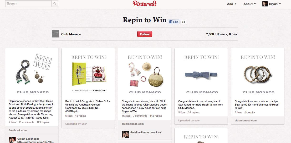 What Club Monaco gets from this “Pin to Win” contest is increased brand exposure. Users that follow those who repin the items are exposed to Club Monaco products they may otherwise not have seen. The end result is added brand awareness and purchase intent.