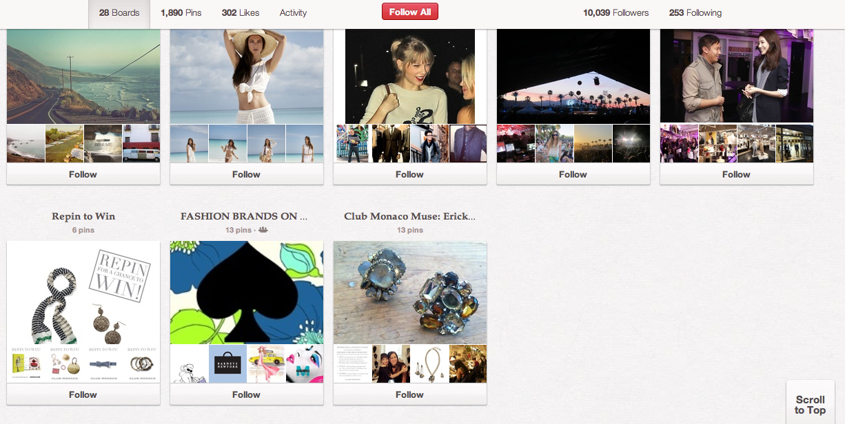 While I think Club Monaco is doing a great job of using the new social media tool, I think they also need to up their marketing for the contest. For example, the “Pin to Win” board is at the very end of their Pinterest profile, so users have to scroll to the very bottom to see it. Since it is promotional, they should move it to the top, which is an easy fix. Additionally, the images of products to win should link to the product or product department on their e-commerce site. This will increase the likelihood Club Monaco would actually see conversions from their Pinterest marketing.
