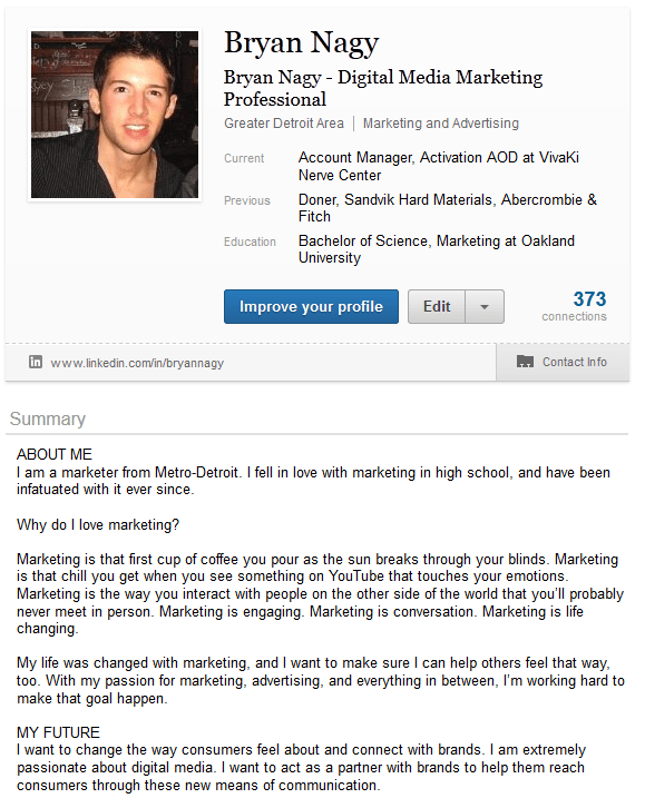 2. Links are now less important. If you want to drive traffic to links previously shown at the top of your profile, add these to your summary, but do so in a matter that makes people want to click. For example, don’t simply make these links your summary. Instead, incorporate them into your summary (ie Follow me on Twitter to learn more about why I love digital media.)
