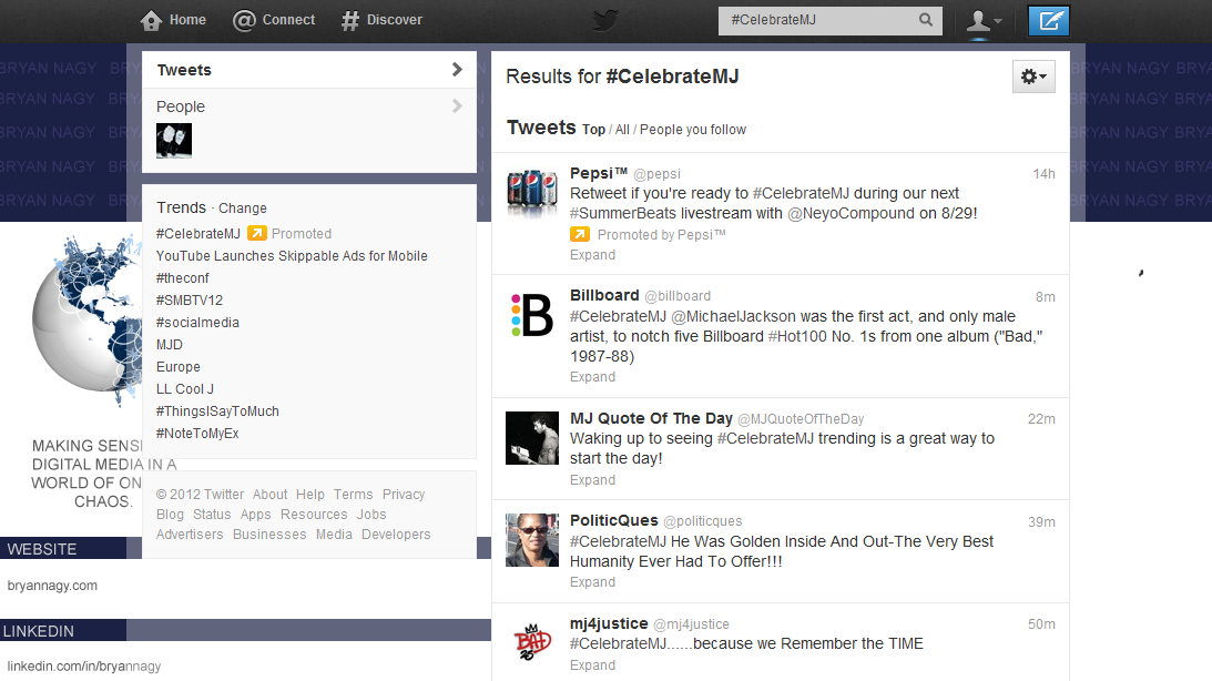 User engagement with the #CelebrateMJ hashtag was extremely positive, praising Michael Jackson for his work and asking all to remember his passing. Many tweets around the #CelebrateMJ hashtag also included information about Pepsi’s Summer Beats livestream, telling users to “CelebrateMJ on August 29th”. The end result was increasing awareness of Pepsi’s Livestream in a positive manner. While there could have been a consumer backlash against Pepsi for using Michael Jackson’s death as a means to promote its Livestream, because Pepsi used the hashtag in his memory, consumers actually embraced the hashtag. This is a great lesson for many brands, some of which have “accidentally” used trends on Twitter to promote themselves, only to find out the trend was about a negative and unfortunate event (one that recently comes to mind is the shootings in Aurora, Colorado, where some brands jumped on the hashtags before apparently checking the news).