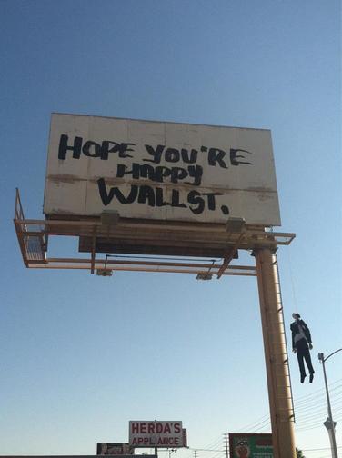 Motorists in Nevada were surprised a few weeks ago when they drove past two billboards which had dummies dangling from the signs from rope wrapped around their necks. Ominous text on the signs read “Hope you’re Happy Wall St” and “Dying for work”.