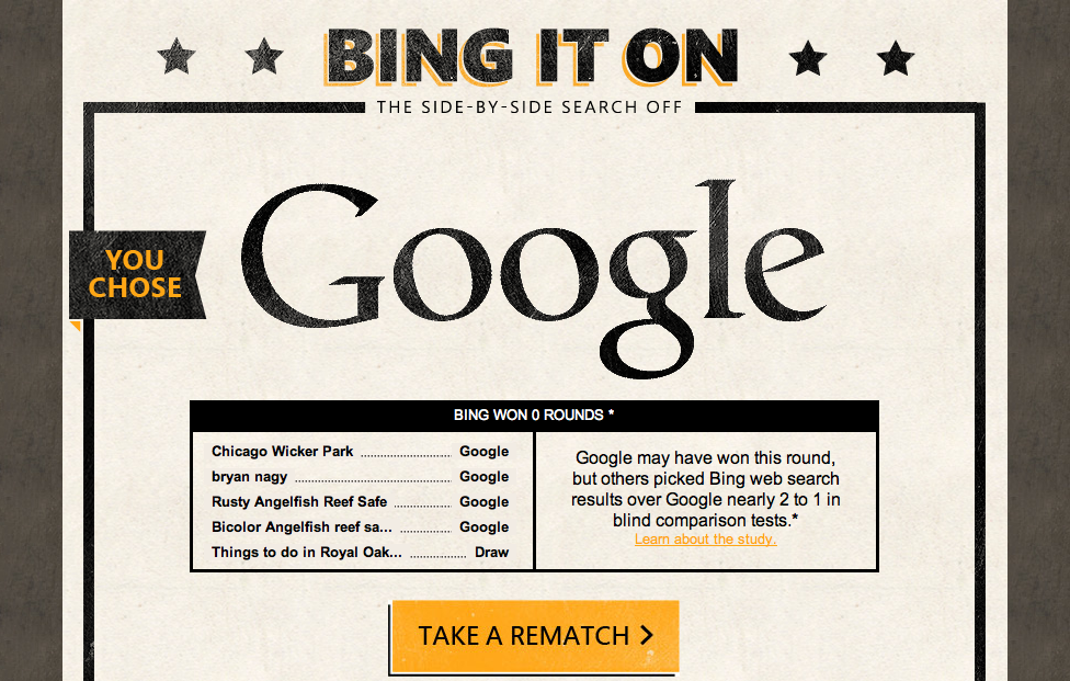 “Bing it On” is an interesting marketing scheme that Bing has created for themselves. In the end, if users had preferred Bing results, these users might being using Bing, which means more users for Bing, more searches, and more advertising dollars. If users had preferred Google results, these users probably will never use Bing, especially after discovering they never preferred Bing search results. It is a risky move on Bing’s part, but they likely think the risk is worth it.