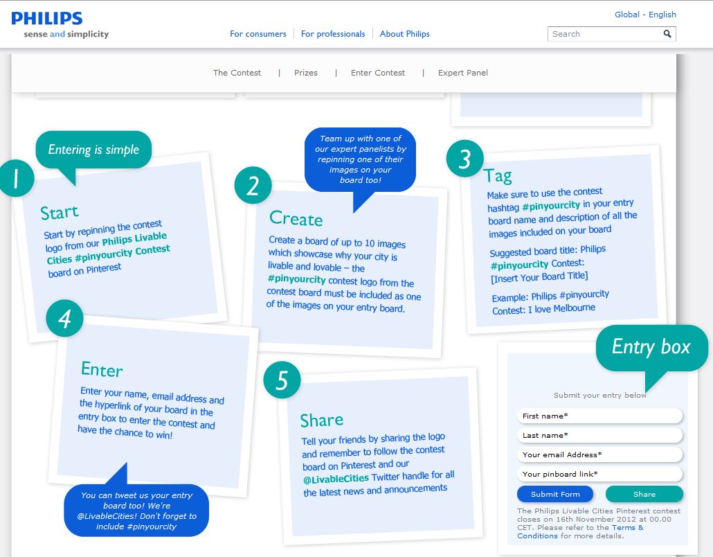 The contest is called the “Philips Livable Cities #pinyourcity Contest.” The contest searches for the most liveable cities across the world. To enter the contest, users create a Pinterest board pinned with images around their city that tell why their city is both livable and loveable. A panel of city experts developed by Philips will judge all entries. The boards that are the most inspiring and creative win the contest. Users must also label their Pinterest boards with the hashtag “#pinyourcity” for easy searching and exposure on Pinterest.
