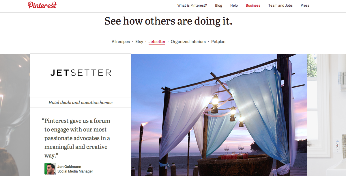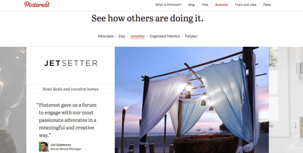 - It offers business resources, such as how to use Pinterest, tools provided by Pinterest, brand guidelines, and examples of how businesses have used the site to market themselves.