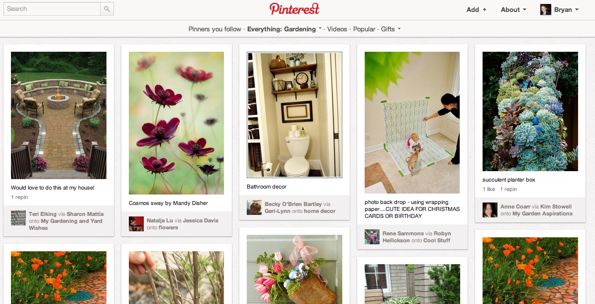 Lets pretend you’re a home and garden brand. You create a profile on Pinterest and categorizing you boards as containing “garden” content. As a result, whatever you pin lands into the Garden section of Pinterest. Anyone looking at the pins on the section will see your pins. If they find your pins interesting, they might like, comment on, or reshare your pin. They may even begin following your boards.This means that whenever they log into their Pinterest account and go to their homepage, they’ll see your pins.
