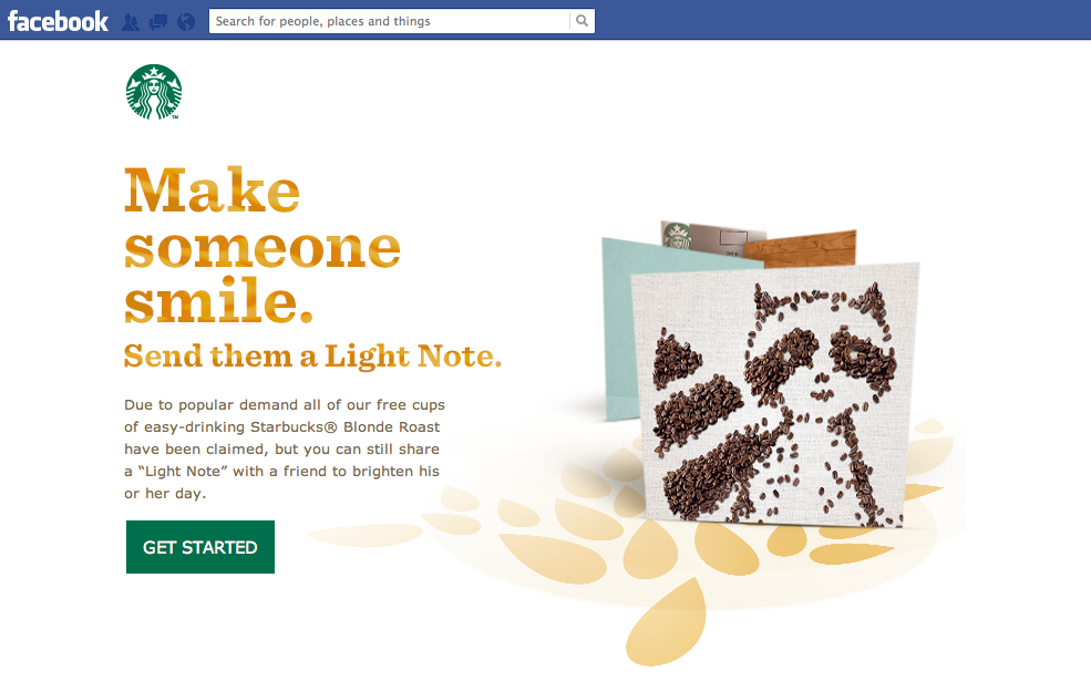 The promotion was included in a Facebook app on the Starbucks Facebook page. Here, users could learn about the roast, claim their free cup of blonde roast coffee, and send related e-cards to friends and family. The link to the Facebook app was displayed prominently underneath Starbucks’ cover photo.