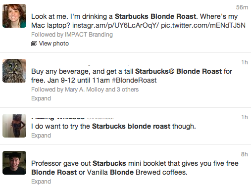 The result of Starbucks’ integrated marketing campaign for its blonde roast proved strong. The internet and social media were full of discussion around the lighter brew. Coupon lovers and moms were especially interested in the promotion due to the free giveaway. A quick look at Google showed most search results were from couponing sites, suggesting these are where most of the discussion and visitors were. Twitter was also full of tweets about the roast, from people posting photographs of themselves enjoying the light blonde roast to sharing word of the free coffee giveaway.