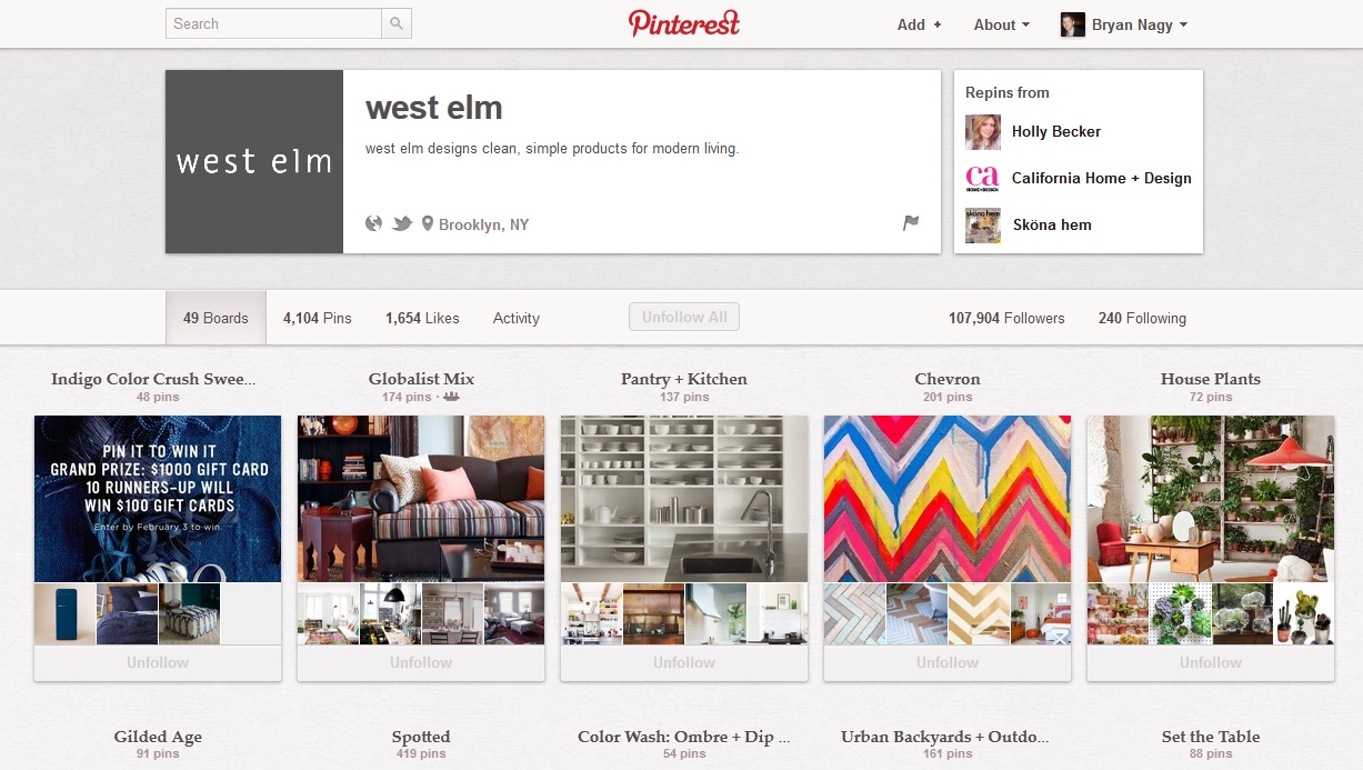 Home goods store West Elm has taken the plunge into Pinterest marketing. The Pottery Barn-owned company launched its first Pinterest campaign January 22nd. The campaign centers around a Pin to Win sweepstakes and is integrated across multiple media channels, including Facebook, Google+, Instagram, and West Elm’s Blog “Front & Main.”