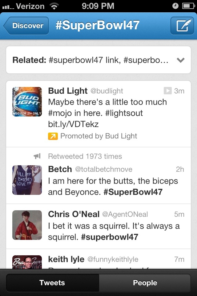 After the lights went out at the Super Bowl, several brands quickly published posts on Facebook and Twitter relating the the outage. Posts made by Ford, Oreo, and Bud Light are below.
