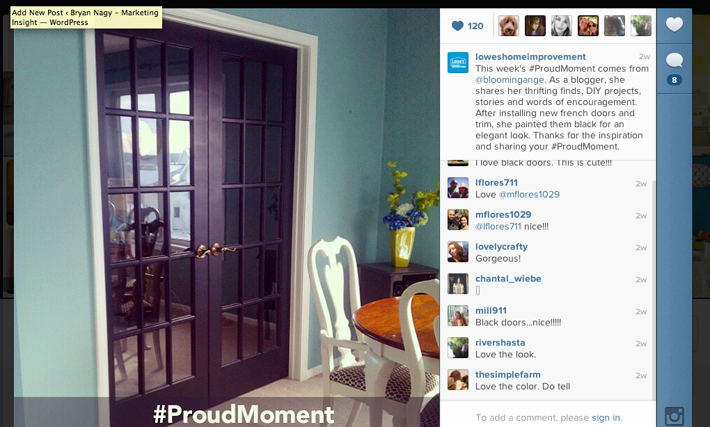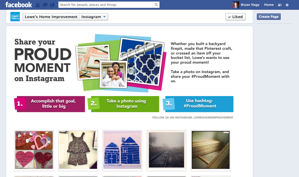Users are asked to take photographs of a proud home improvement moment, such as updating a piece of furniture, putting in a garden, or completing a holiday craft. This photograph must be uploaded onto their Instagram account with the hashtag #ProudMoment. Using the hashtag, Lowe’s selects a “winner” each week whose photo is featured on the Lowe’s Instagram page.