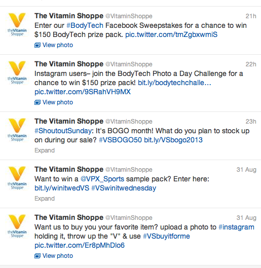 Let’s look at the content the Vitamin Shoppe is posting on Twitter. The majority of posts revolve around contests. This could make sense, as many brands promote contests on social networks, which typically drive a hefty amount of interaction with customers. However, this is where the Vitamin Shoppe falls short. If we look at the contests promoted within just the last two days, you’ll see that at least eight different contests were being promoted. That’s right- at least 8. Why do I say at least? Because it’s extremely confusing for a consumer to understand what exactly the contests are. To make things even more confusing, many of these contests are being ran on other sites, like Pinterest and Instagram. So, not only do we have a brand promoting too many contests at once, we have a brand running contests on too many platforms at once. What does this do? Well, it doesn’t drive the consumer to buy.