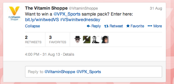 What’s even more concerning than the content being posted on Twitter? The timing of it. You’ll see that one tweet posted on a Saturday is promoting the hashtag #VSwinitwednesday. Wait a second? Why is the Vitamin Shoppe posting a contest that runs on a Wednesday on a Saturday? I understand the contest can take entries at any time, but this is only found out by clicking on the tweet. Any consumer just casually looking through their newsfeed has no idea this is the case.