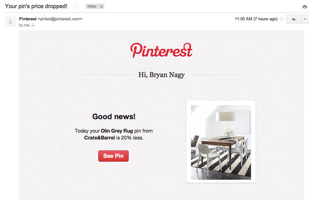 For consumers, these emails provide value in the form of information. With the rug I pinned, I was actually excited to see the email and learn that the product I liked was now on sale. Not only did this drive me to consider purchasing the product, it drove me to the company’s website yet again, causing me to look at even more products.
