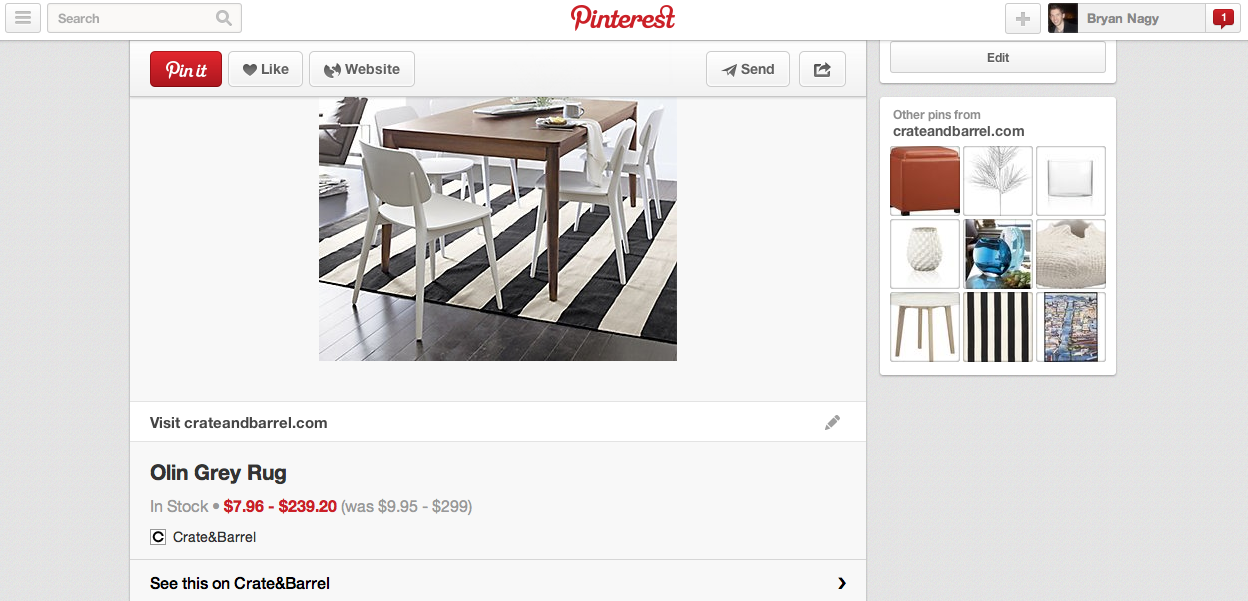 When I clicked on the pin in the email, I was taken to the pin of the rug I made on Pinterest. Underneath the pin, I was able to see that the price of the rug was in fact dropped, and even listed in red in case I wasn’t sure.