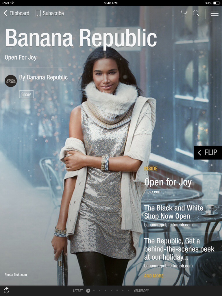 Ah, Flipboard. One of my favorite apps, particularly on the iPad. I am not the only one. The app claims 90 million users. With the huge user base, brands are trying to find a way to add this outlet into their marketing mix. Guess what? Banana Republic seems to have found the answer through Flipboard’s magazines.