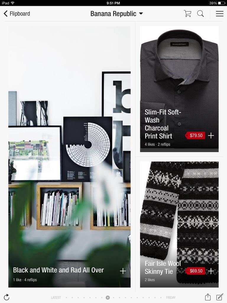 What exactly can users do with and a Banana Republic magazine on Flipboard? Product content links to the product on the Banana Republic website, allowing customers to purchase the product within the Flipboard interface. In addition to purchasing, users can like the products on Flipboard, reflip the products into their own custom magazine, share them with friends, and comment on them. This leaves room for a ton of engagement possibilities, not to mention possible sales.